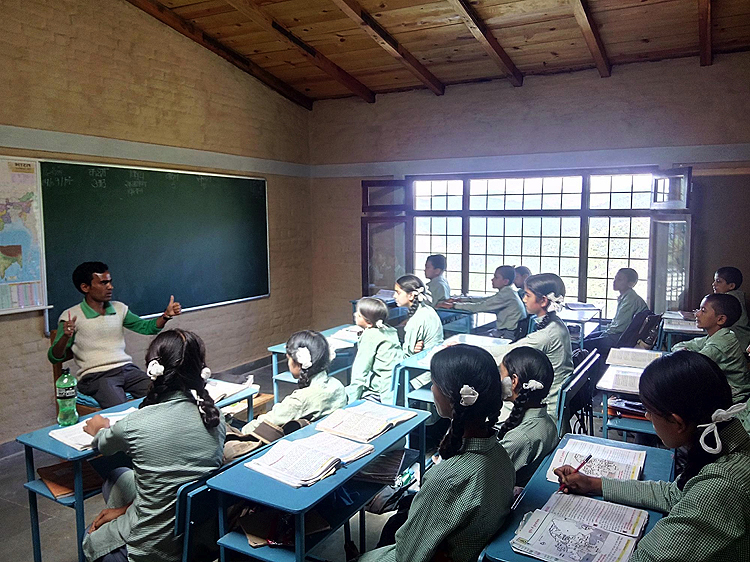 Der Bau liegt terrassenartig an einem Osthang mit Blick auf die Himalayahauptkette. Über einen umlaufenden Balkon im ersten Obergeschoss werden die Schulzimmer und die Bibliothek erschlossen. Der Bau wurde in Betonskelettbauweise mit Backsteinausfachung ausgeführt. 2014, nach dem Sammeln weiterer Spendengelder in der Schweiz, wurde das Dachgeschoss mit Versammlungssaal realisiert. Aarohi Indien: www.aarohi.org