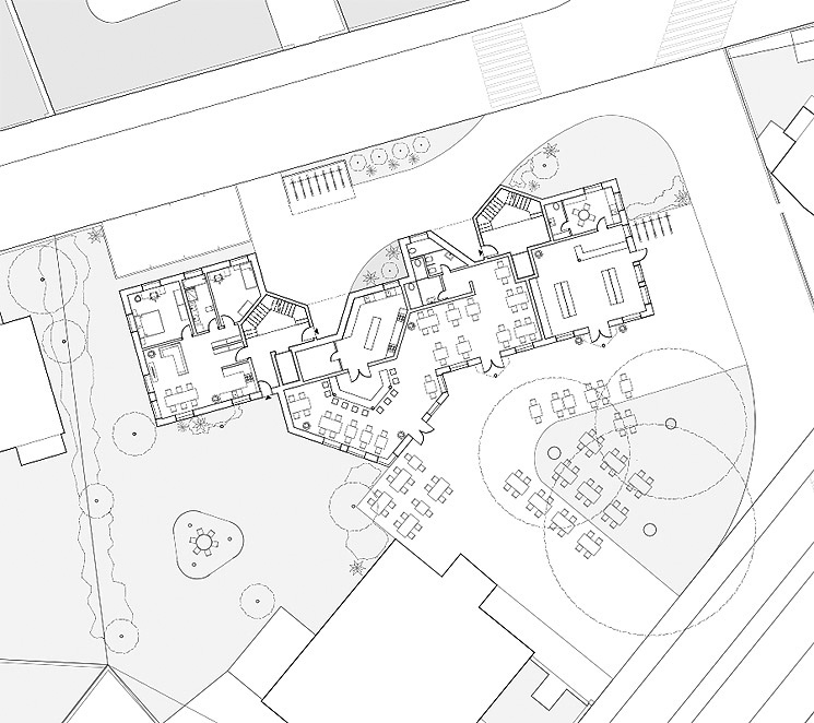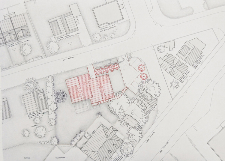 Aus alle dem leiteten sich erste Überlegungen zur ortsbaulichen Setzung eines Baukörpers ab, zu Eingängen, Aussenräumen und der Beziehung des Inneren zum Aussen.