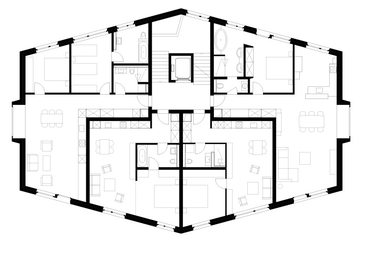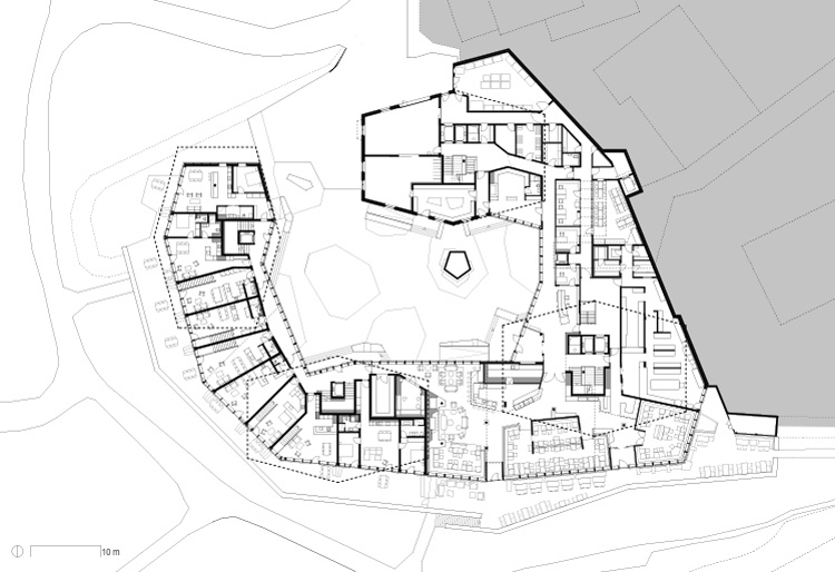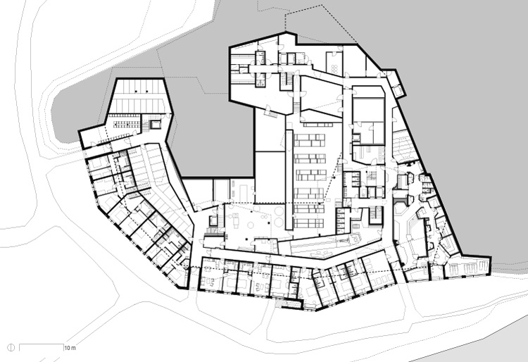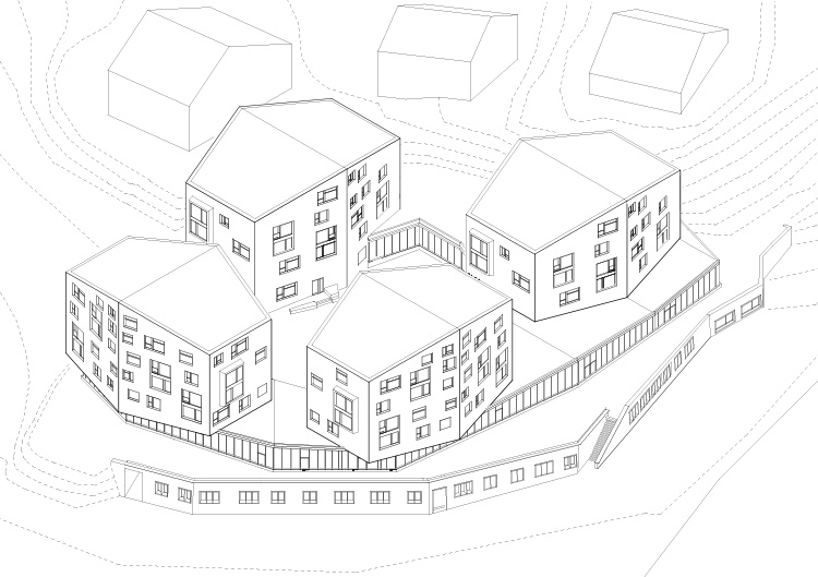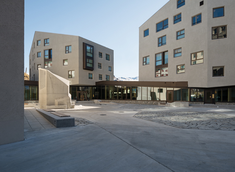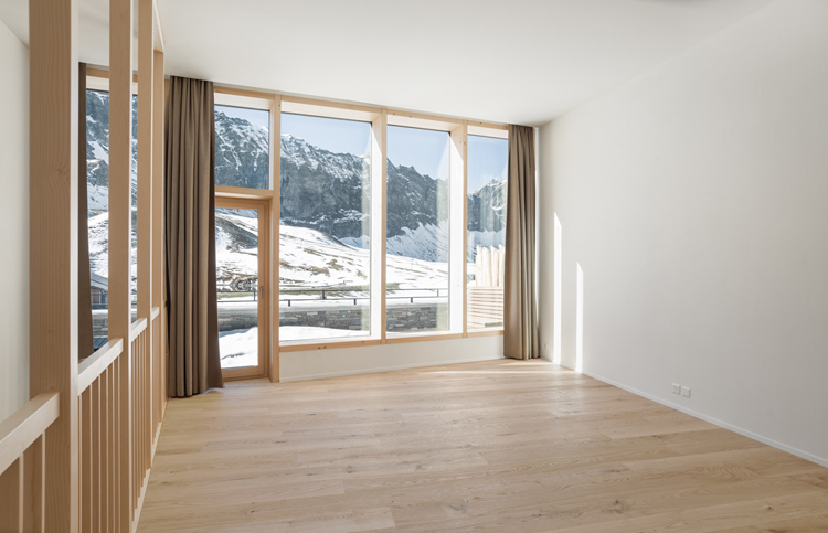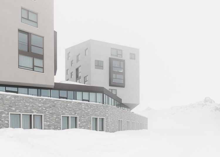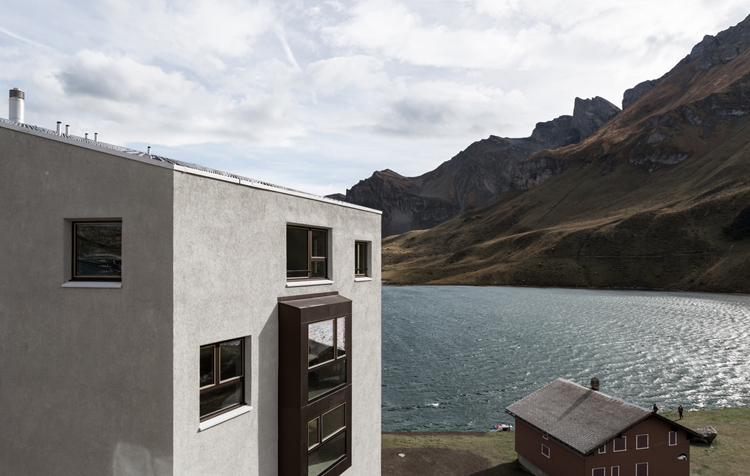 Der Neubau «Frutt Family Lodge & Melchsee Apartments» liegt am Obwaldner Melchsee auf rund 1900 Metern über Meer. Das Vier– Sterne– Hotel mit 47 Suiten und Zimmern sowie die 43 Ferienwohnungen sind auf vier Baukörper verteilt. Sie markieren als Schlussteine den Übergang des Ortes zum See. Die Architektur nimmt die ortsübliche Bauform des freistehenden Giebelhauses auf und lehnt sich an Berghütten an. Jedoch scheinen die schweren Baukörper über dem verglasten Sockelbau zu schweben.
