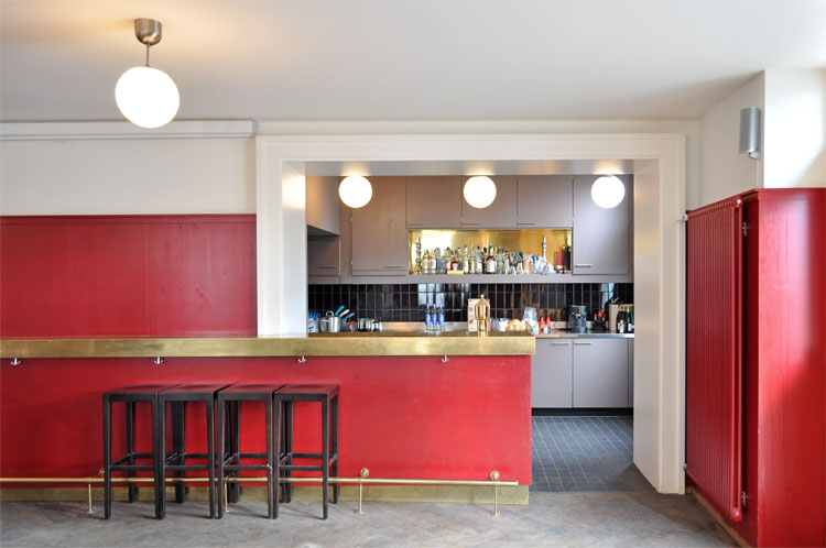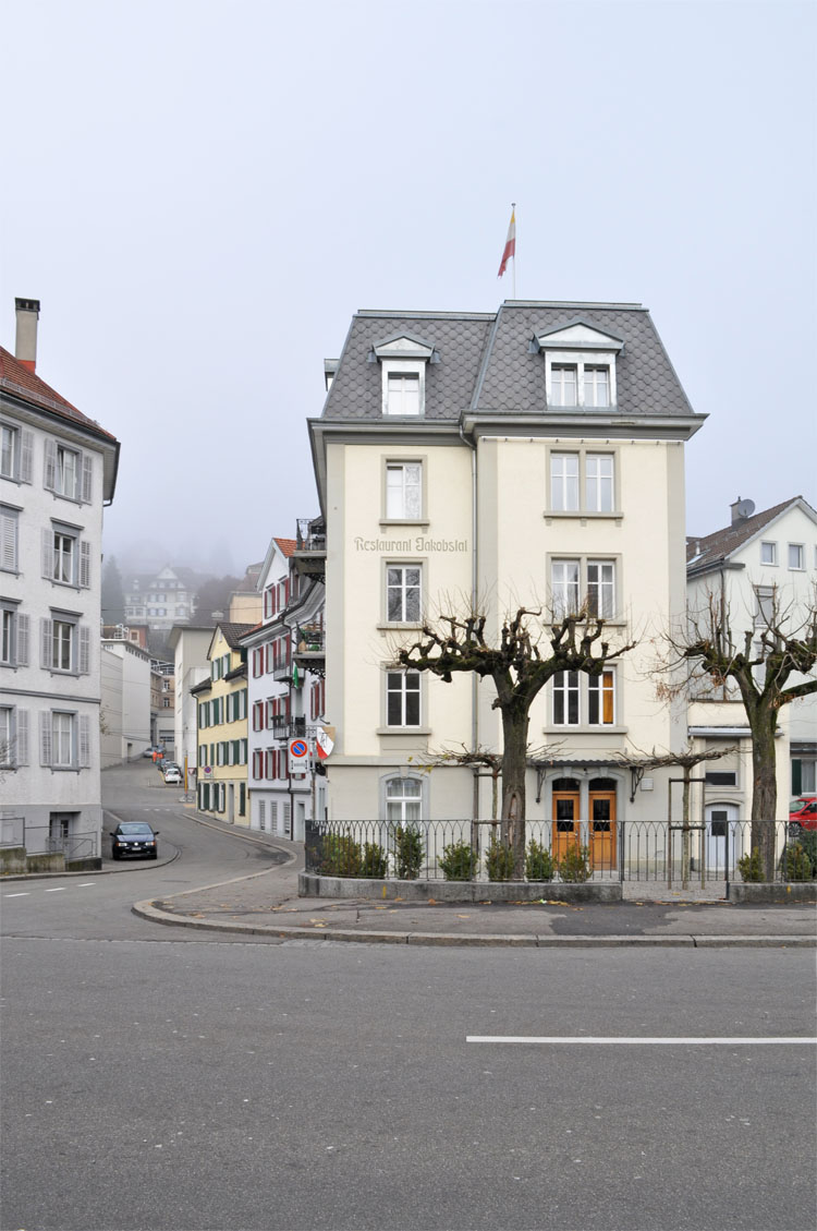 Das Haus Jakobstal dient seit gut zwanzig Jahren der Studentenverbindung A.V. Amicitia San Gallensis. Das Projekt umfasst den Umbau des alten Restaurants in eine Bar für private Anlässe der Verbindung und für Externe. Die Eingangspartie, Küche und Sanitärbereiche wurden verlegt und neu gestaltet. Mit erheblichem Aufwand konnten die historischen Stahlstützen als ästhetische Raumdominanten erhalten werden. Die Gestaltung der Bar, des Wandtäfers, der Kugelleuchten und der Möbel oszilliert zwischen Klassizismus und Moderne. Wie die Mitglieder der Amicitia wird damit auch das Haus Jakobstal zur lebendigen Verbindung zwischen Tradition und Moderne.