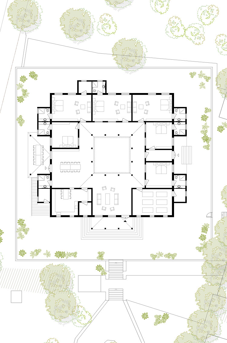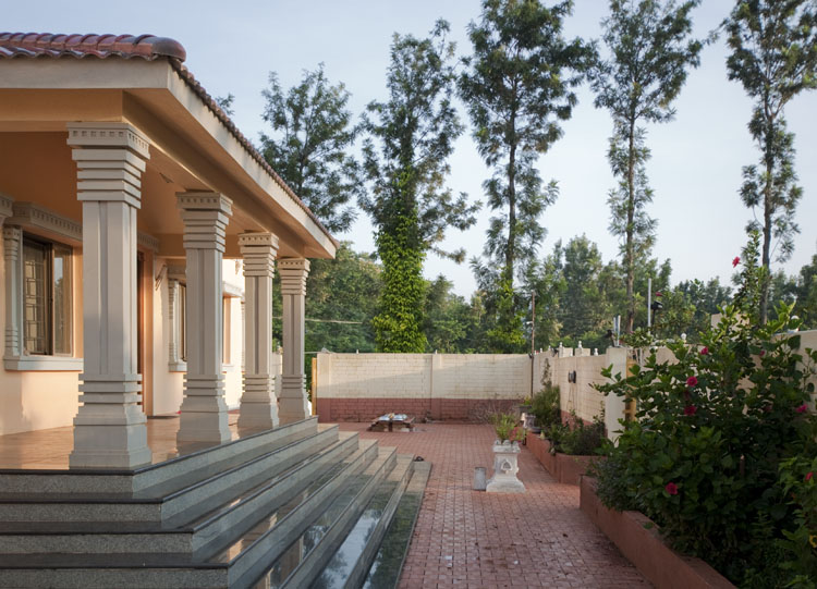 Die Siddhamed Farm befindet sich auf dem Hochplateau der Kolli Hills in Tamil Nadu in Indien. Neben dem ökologisch und sozial nachhaltigen Anbau von Heilkräutern betreibt die Farm ein Gästehaus für Meditationsgruppen. Die Farm verfolgt einen ganzheitlichen Ansatz, in dem Ökologie, ganzheitliche Medizin, dörfliche Gemeinschaft und Tourismus ein stimmiges ganzes Bilden. Der Entwurf der Häuser folgt dem Vorbild des klassischen indischen Hofhauses. Um Klima und den kulturellen Strukturen gerecht zu werden, wurden in der Planung alle Regeln des Vastu Veda – der traditionellen indischen Lehre des Bauens – befolgt. In den nächsten Jahren plant Siddhamed die Errichtung weiterer touristischer Infrastrukturen, für die unser Büro einen Masterplan erstellte. Als erste Etappe ist für 2023 die Errichtung eines Tempels geplant.